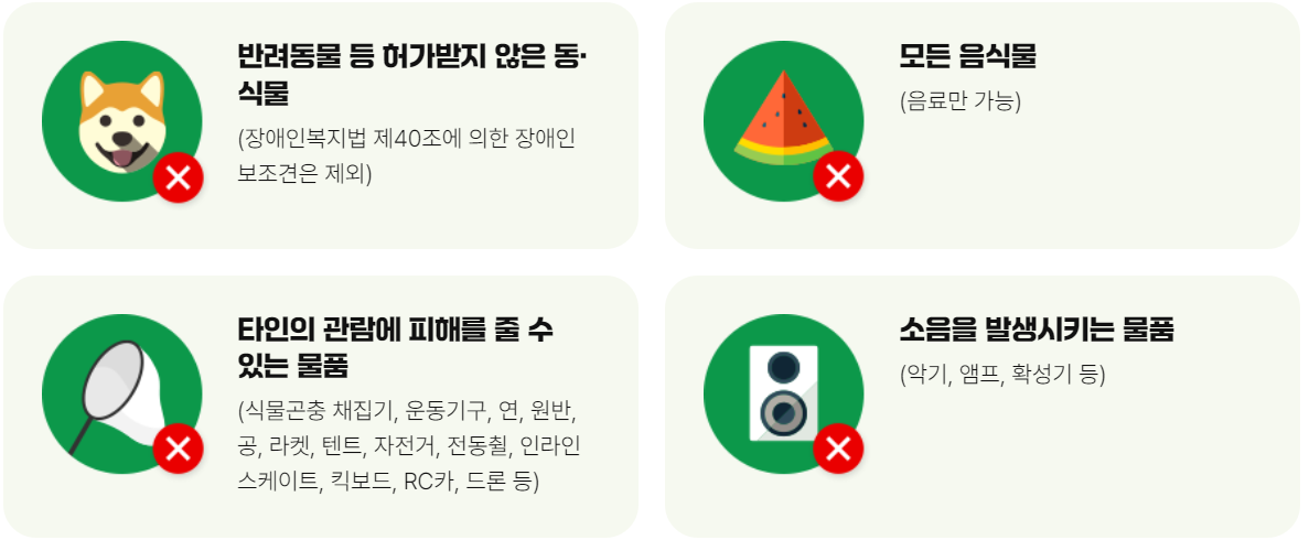 - 타인의 관람에 피해를 줄 수 있는 물품
