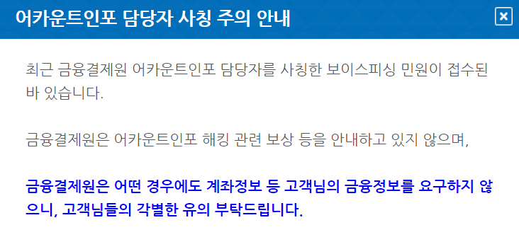 퇴직연금이다보니 어카운트인포 담당자를 사칭한 보이스피싱 민원이 접수되고 있으니 주의하시기 바랍니다.