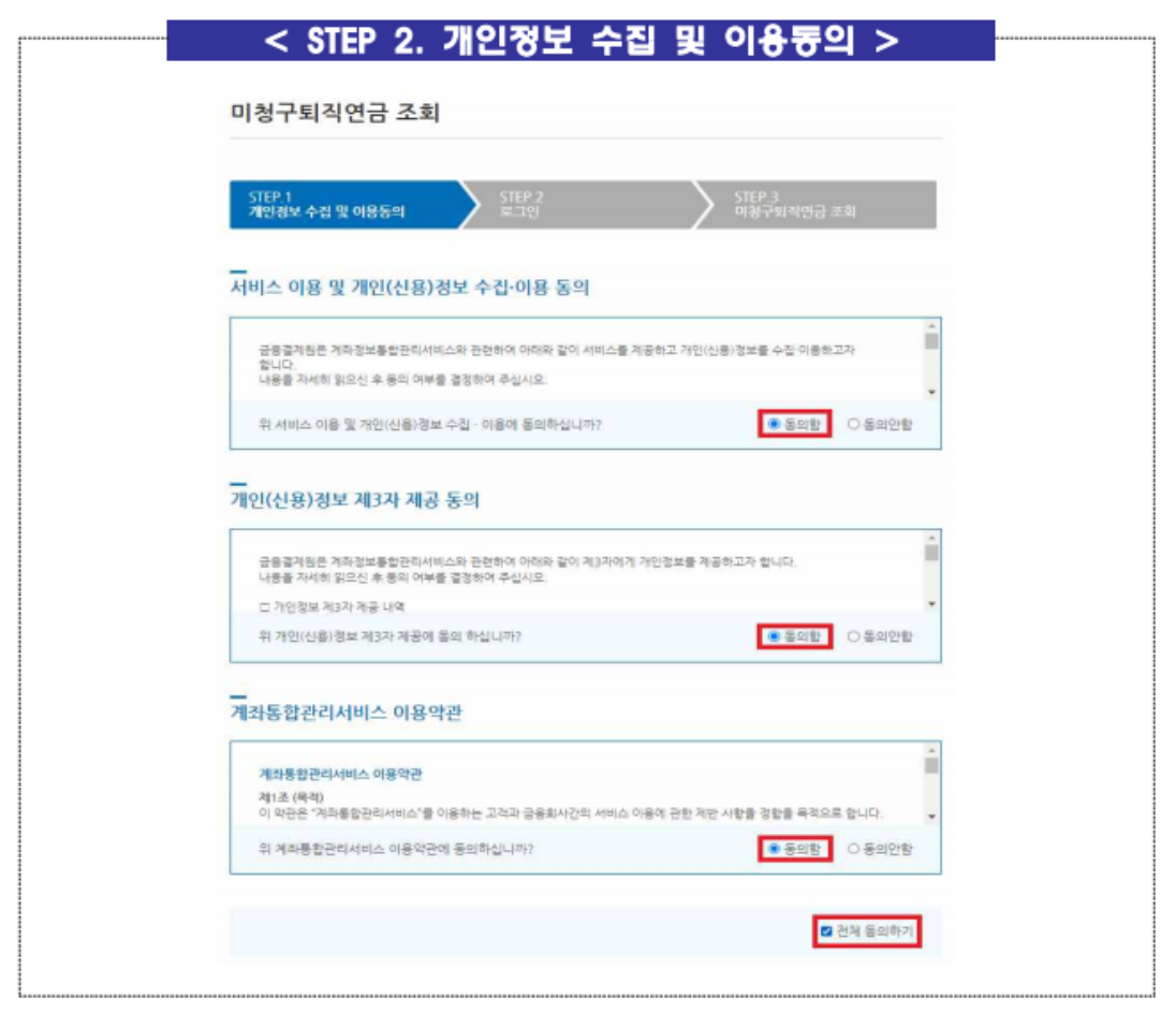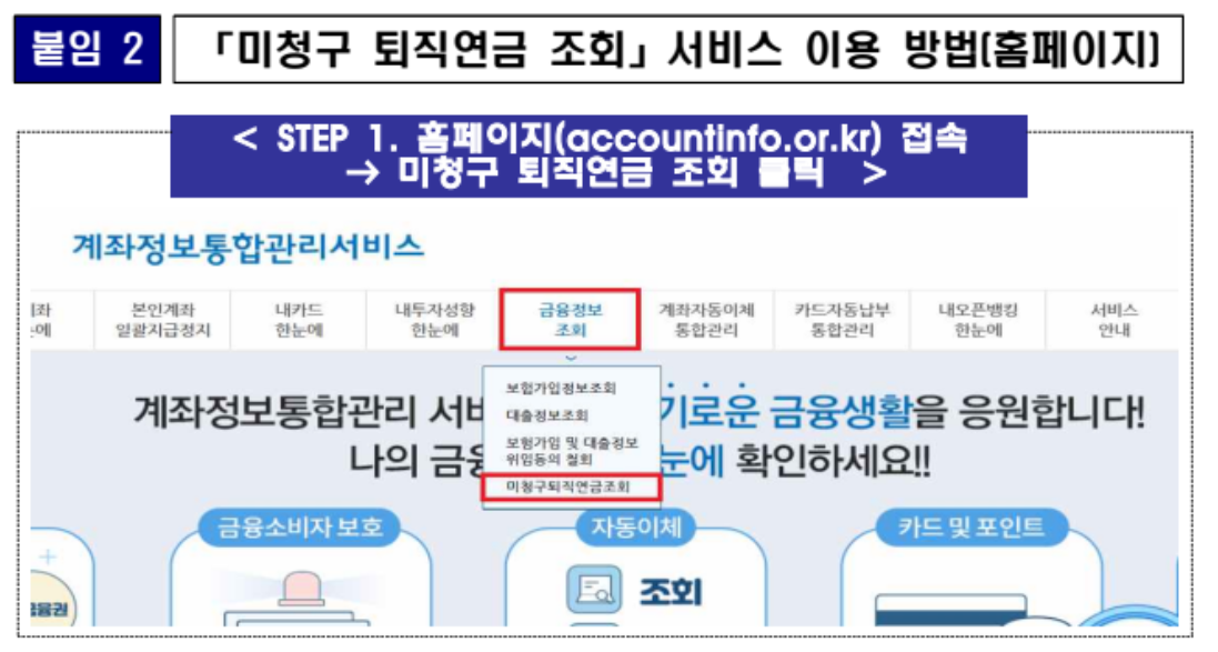 때문에 고용부, 금융위, 금감원, 금융결제원, 한국예탁결제원 등과 금융기관이 연계하여 어카운트인포를 통해 본인의 미청구 퇴직연금 정보를 확인할 수 있는 시스템입니다.