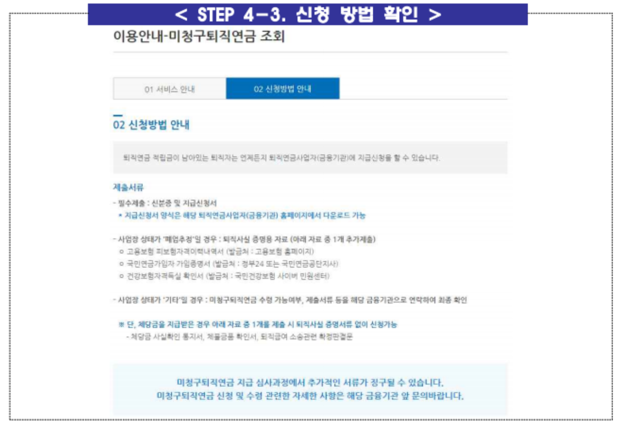 본인의 미청구 퇴직연금 정보를 확인했다면 해당 금융기관에 연락하여 연금 수령 절차를 진행하면 됩니다. 미청구 퇴직연금의 최종 지급을 위해서는 신분증, 지급신청서, 고용관계 종료 확인 가능 서류(고용보험 피보험자격이력내역서 등) 등이 필요합니다. 어카운트인포에서 필요 서류, 발급처 확인이 가능합니다.