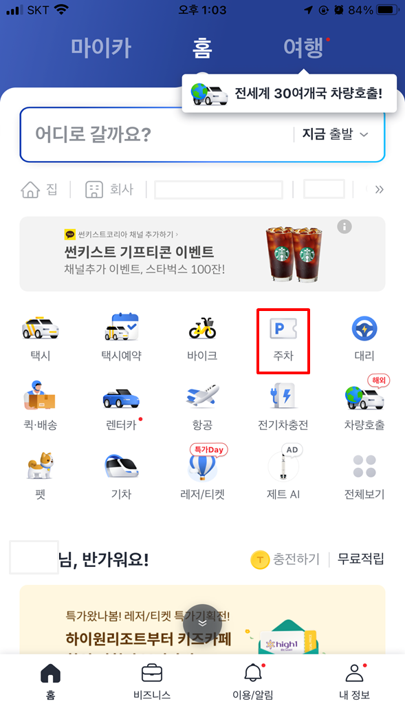 주차장 찾아 배회하는 것은 이제 그만! 목적지 근처 주차장 검색부터 예약, 결제까지 한번에 해결됩니다. 카카오T 앱을 다운로드 받으셨다면 실행시킵니다. 그리고 주차 버튼을 클릭합니다.