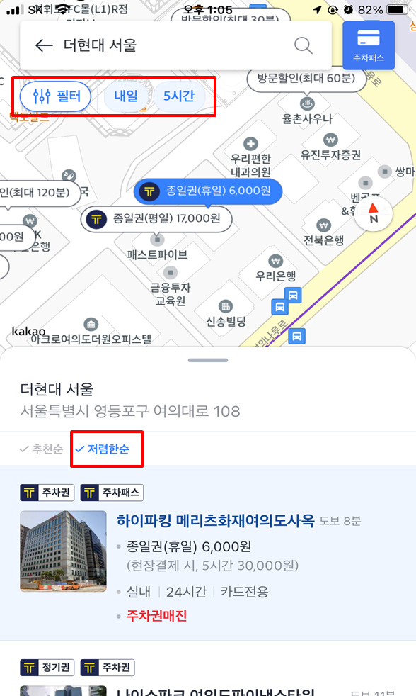 저렴한순 탭을 클릭하면 근처 주차장 목록이 나옵니다.