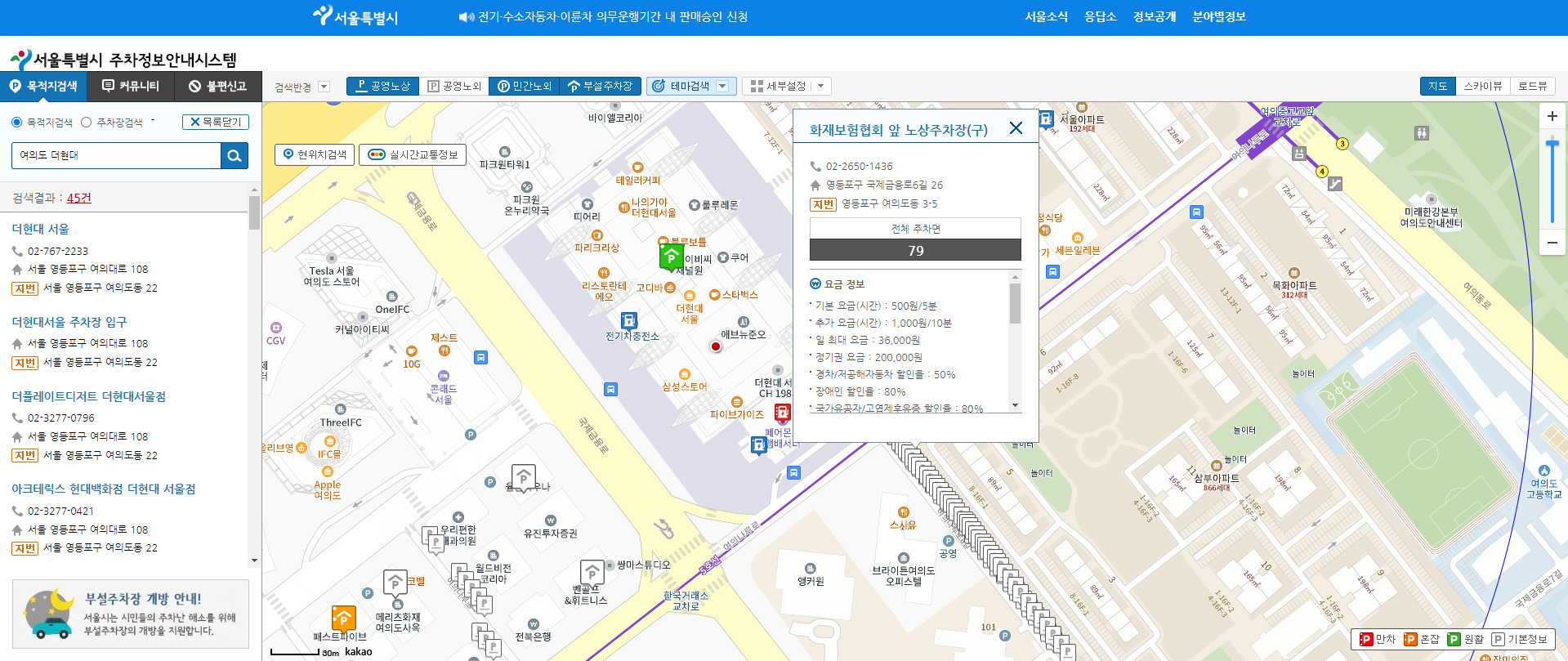 더현대를 쭈욱 둘러보는데만 많은 시간을 할애해야하는데 주차비 때문에 빨리 나가야할 판입니다. 서울 시내의 대형 상업시설은 교통환경영향평가 통과를 위해 교통 혼잡 저감 차원에서 최대한 차량 이용을 자제하도록 유도해야 합니다. 먼저 여의도 공영주차장 요금은 어디서 확인해야할까요?