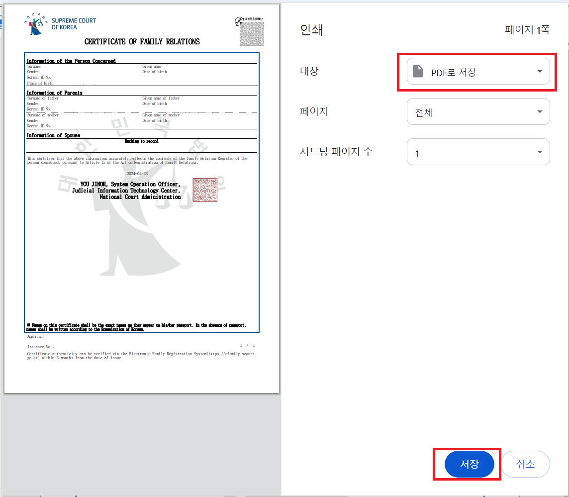 영문 가족관계증명서를 PDF 서류로 저장하고 싶다면 아래 방법으로 쉽게 할 수 있습니다.