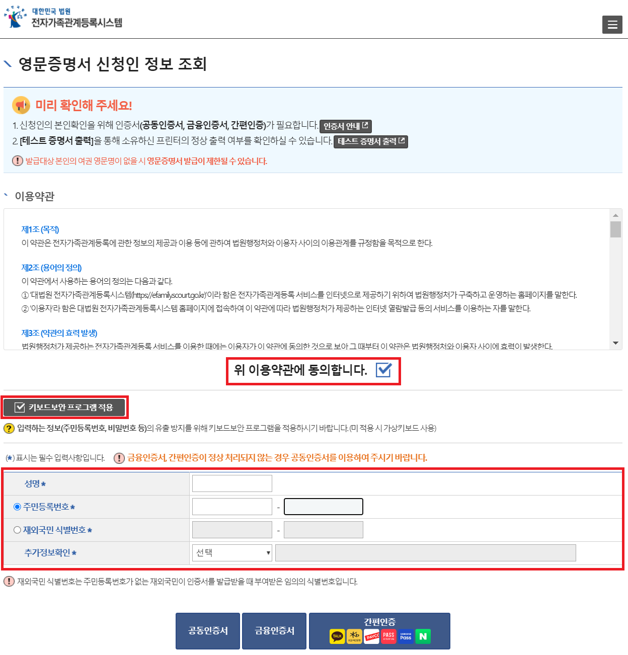 이용약관에 동의 체크, 키보드보안 프로그램 적용 체크, 성명과 주민등록번호, 추가정보확인을 적습니다. 추가정보확인에 저는 '배우자 성명'를 선택하고 성명을 기입했습니다.