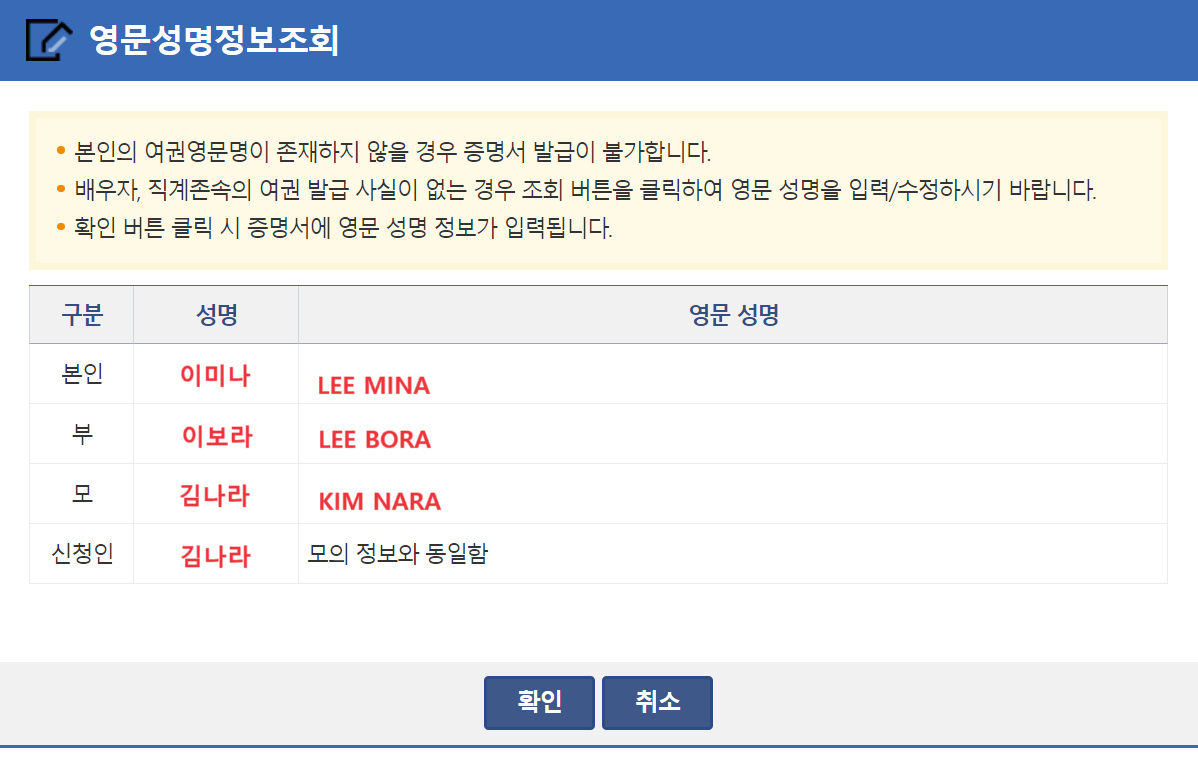 3번 대상자 영문성명을 입력해주세요. 본인 및 가족의 외교부 여권정보 중 영문 성명 활용에 동의하시겠습니까? 부분에 동의를 체크를 하면 영문성명정보조회가 새창으로 뜹니다.