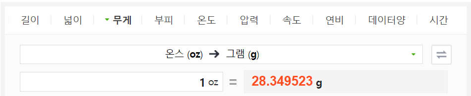 참고로 금이나 은의 무게를 따지는 트로이온스(troy ounce)는 무게가 다른데요. 트로이온스 1온스는 정확하게 31.1034768g 약 31.103g을 나타냅니다. 1트로이온스는 약 8.29426돈입니다.