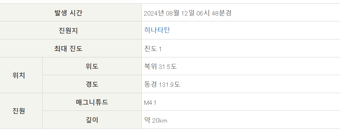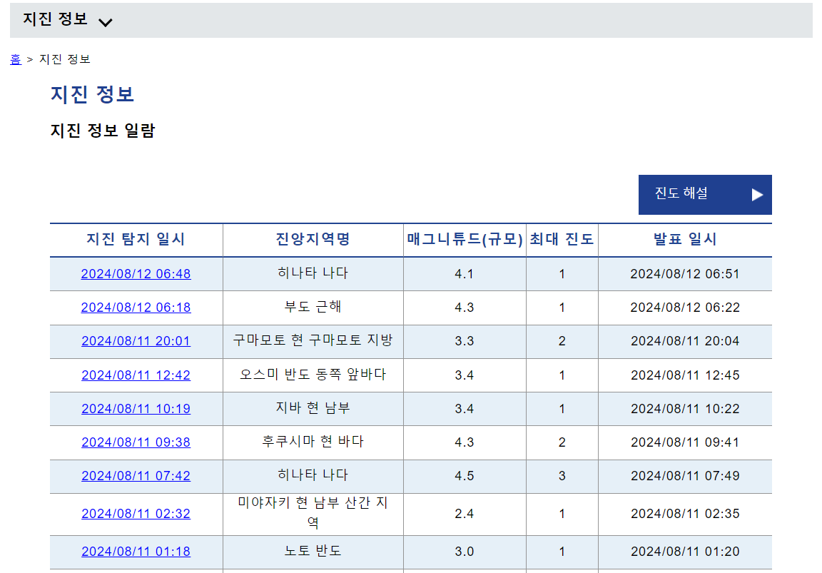 일본 내의 지진 탐지 일시, 진앙지역명, 매그니튜드, 최대 진도, 발표 일시가 나와 있습니다.