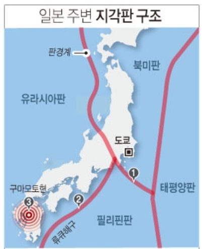 일본은 여러개의 지각판이 만나기 때문에 지진, 화산활동이 많은 나라입니다. 그림만 봐도 북미판, 유라시아판, 태평양판, 필리핀판이 만나는 곳에 위치 해 있습니다. 지진 발생이 많은 지역은 순서대로 도도부현 후쿠시마현, 이바라키현, 미야기현, 이와테현, 구마모토현 등 입니다.