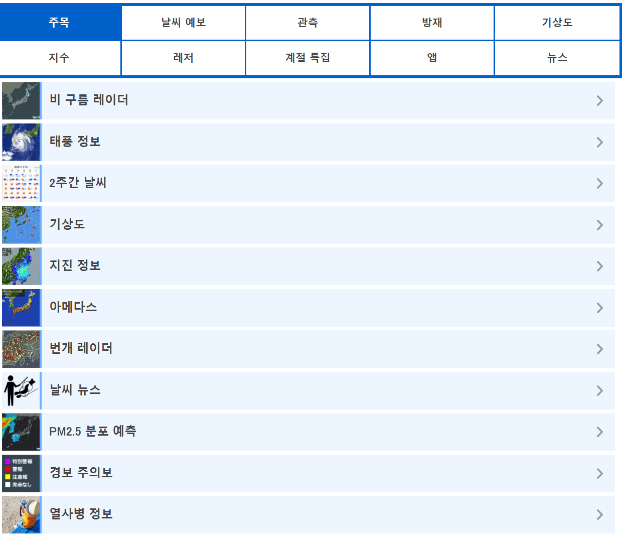 한국에서는 야후를 잘 쓰지 않으나 일본 현지인이나 거주하는 분들은 야후재팬에서 날씨를 많이 봅니다. 구글에서 번역을 하셔서 한글로 볼 수 있습니다.