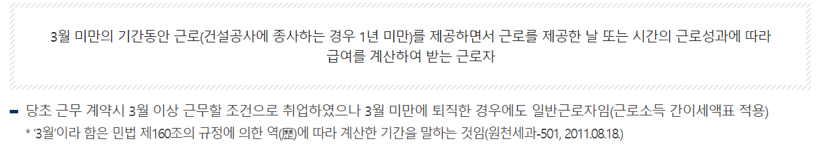 일용근로자는 3개월 미만의 기간동안 근로하며, 근로를 제공한 날 또는 시간의 근로성과에 따라 급여를 계산하여 받는 근로자를 말합니다. 근로자가 일반 근로자로 계약했을 때 3개월 미만 근무한 경우에도 일반 근로자에 해당합니다.