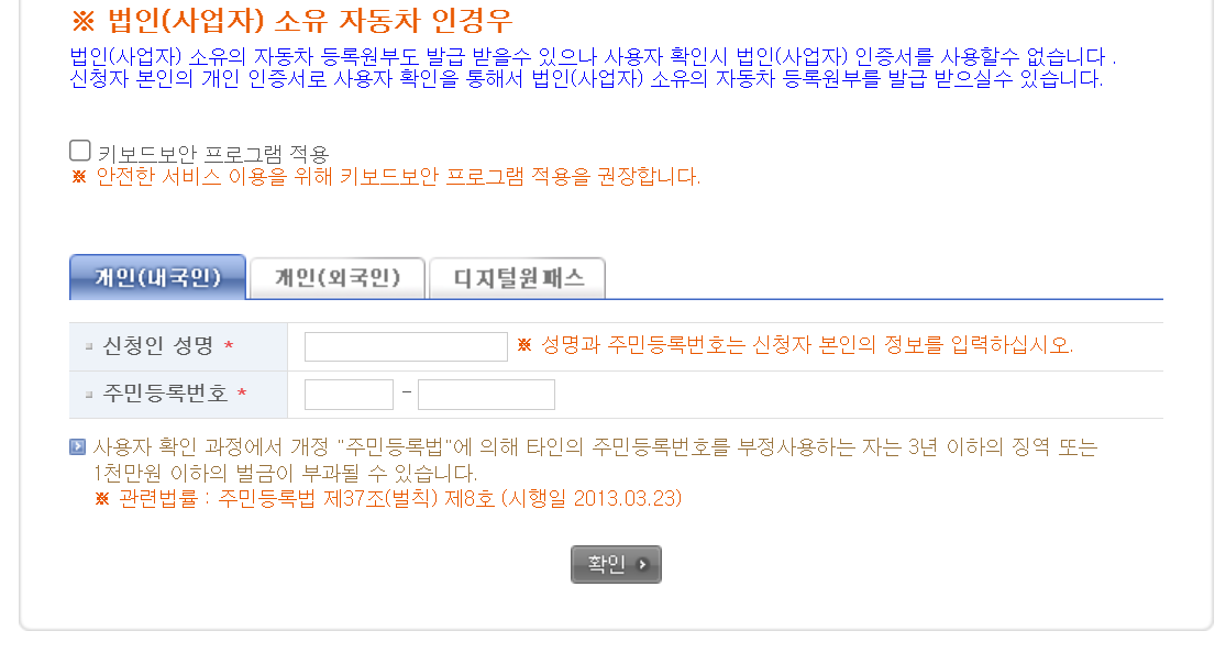 차량등록원부는 차량 소유주가 아니더라도 신청자 본인의 개인 인증서로 조회/열람/발급이 가능합니다. 법인차량의 경우는 법인공인인증서가 아닌 신청인의 개인인증으로 사용자 확인후 발급할 수 있습니다. 타인명의 차량을 열람/발급할 경우는 차량 소유자의 이름과 주민등록번호를 입력해야 합니다.