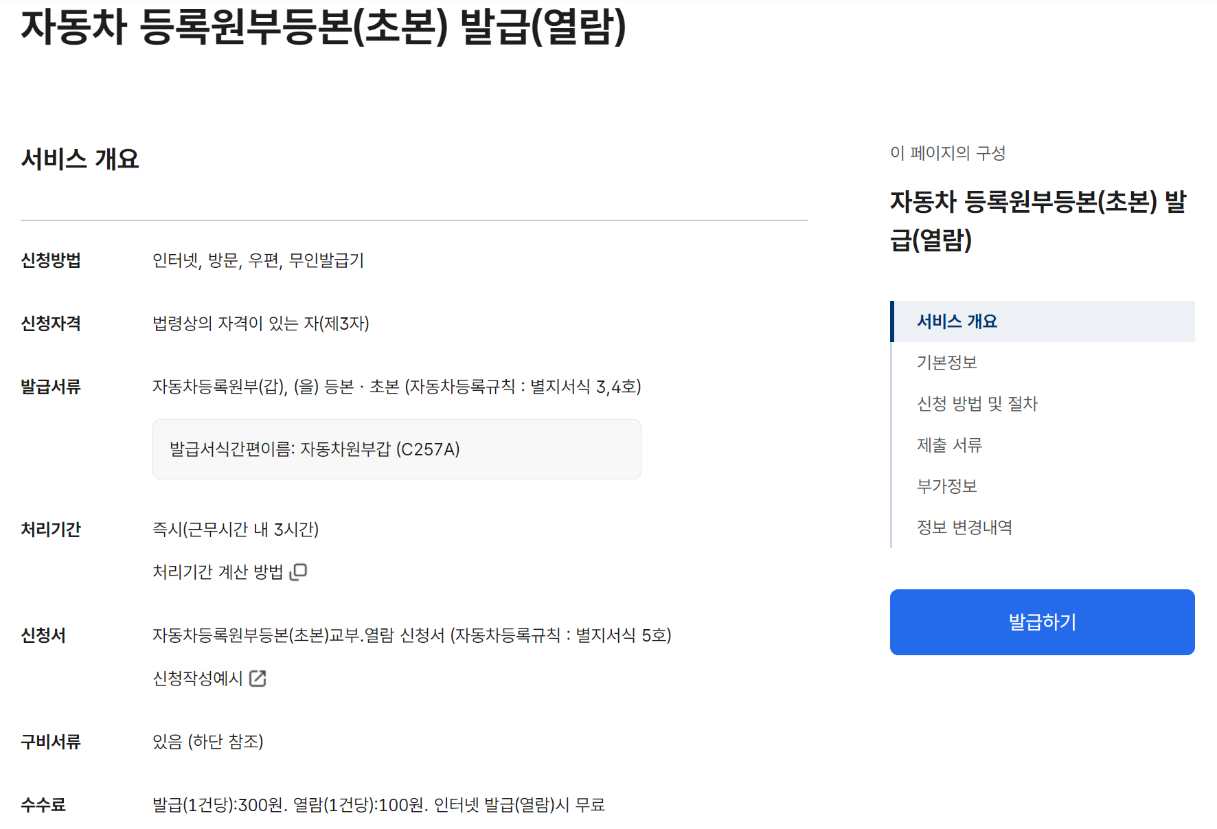 전국의 시/구청/동주민센터 민원실에서 fax민원 신청시에는 3시간 이내에 교부가 가능합니다. 전국 모든 차량 발급이 가능합니다. 발급 1건당 300원, 열람 1건당 100원의 수수료가 발생하지만 인터넷 발급/열람 시에는 무료입니다. 무인민원발급기에서도 열람/발급이 가능합니다.