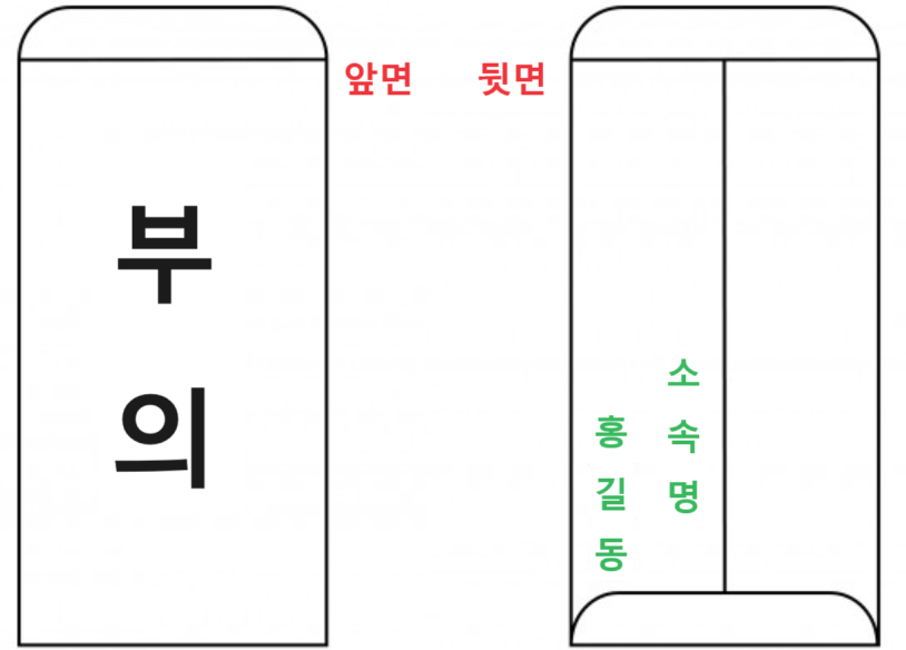 봉투 뒷면 왼쪽 하단에 세로로 한글 이름을 적고, 소속명이나 회사명은 이름의 오른쪽 위에 이름보다 작은 크기로 작성합니다. 새돈이 아닌 헌돈을 내는 것이 관례입니다.