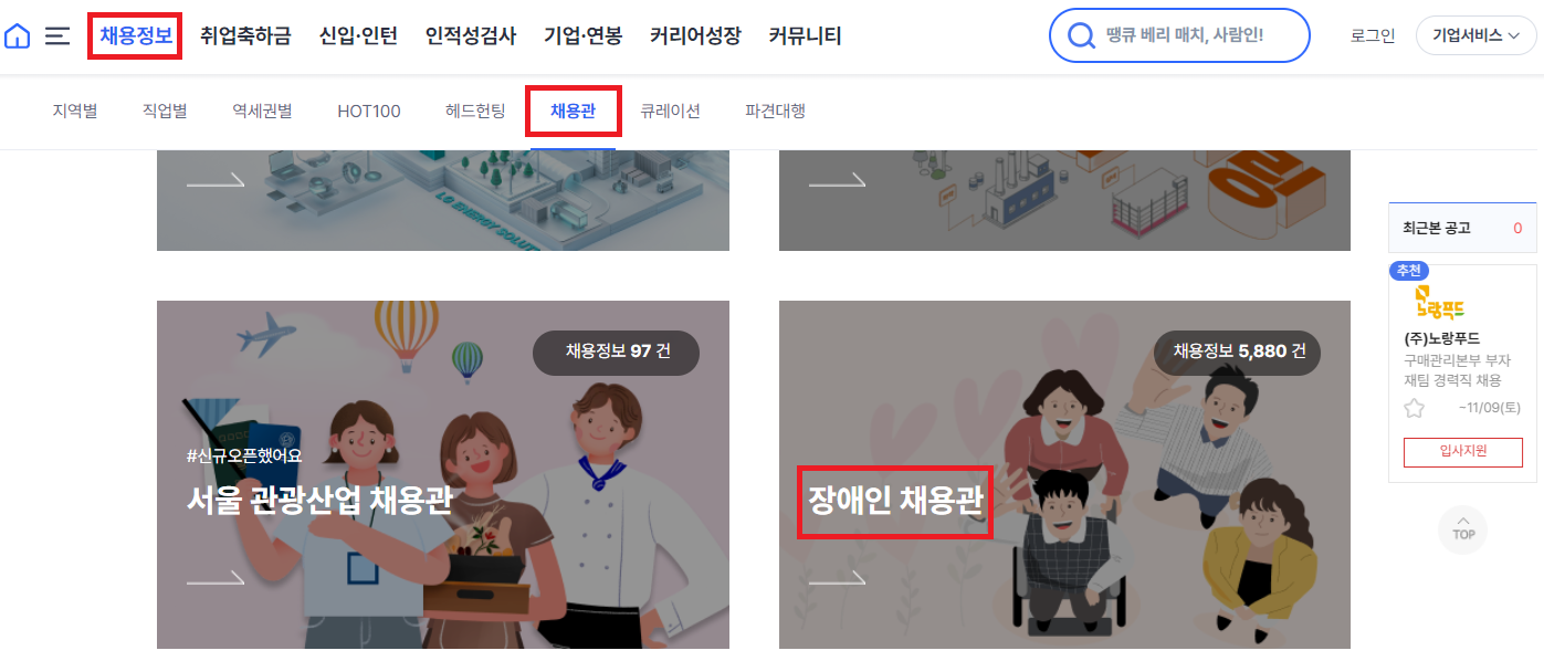 사람인에 접속했을 때 채용정보 > 채용관을 누르면 스크롤을 내려 [ 장애인 채용관 ]으로 이동할 수 있습니다.