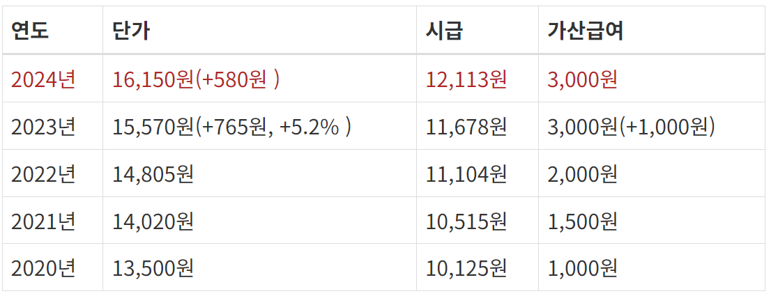 ● 2024년 단가 : 16,150원 (시급 12,113원 / 가산급여 3,000원)