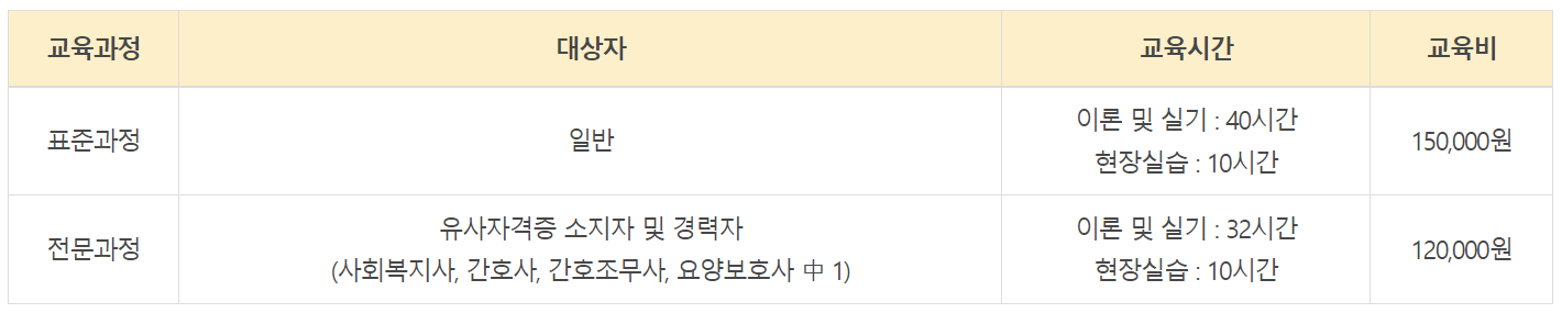 전문 과정은 노인요양보호사나 사회복지사와 같은 업무를 했던 사람을 대상으로 진행되고 이론 32시간과 실습 10시간으로 구성되어 있습니다.