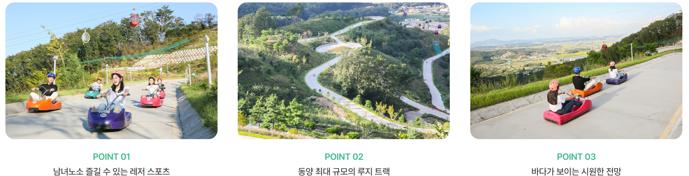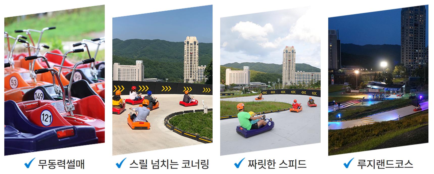 루지는 뉴질랜드에서 개발한 놀이기구로 싱가포르, 캐나다, 뉴질랜드와 국내에서 남녀노소 즐길 수 있는 체험형 레포츠입니다. 카트 조작은 매 회차 직원이 상세하게 알려주기 때문에 걱정 없이 탈 수 있습니다.