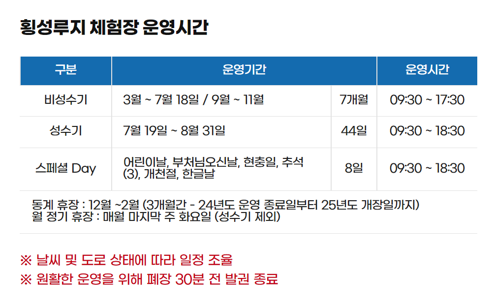 ● 비성수기 3월~7월 18일 / 9월~11월 : 매일 09:30~17:30 (매표마감 17:00)