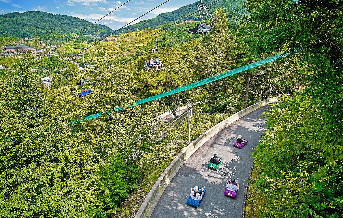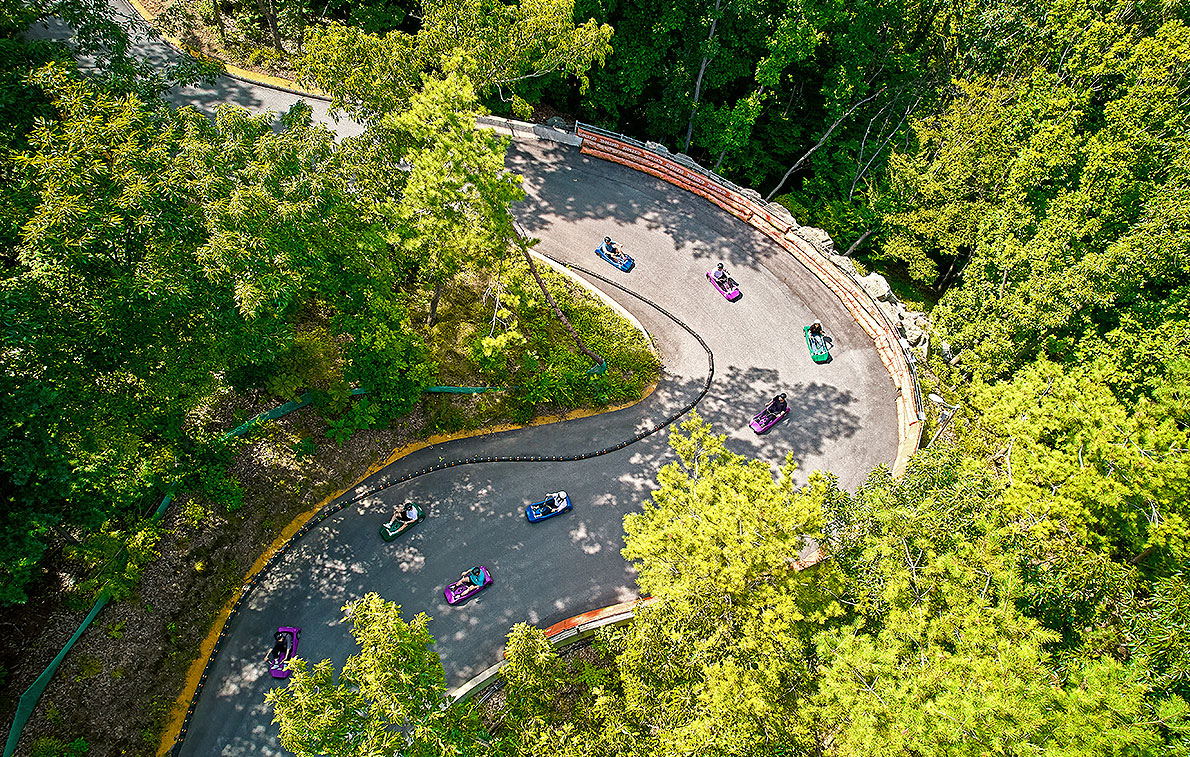 평창 루지랜드는 강원도 평창의 휘닉스 평창 안에 있습니다. 트랙 사방이 푸른 녹음으로 둘러싸여 있어 숲의 기운을 느낄 수 있습니다.