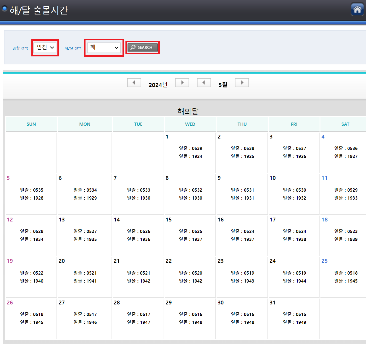 항공기상청에서 제공하는 사이트인데 해/달 출몰시간을 클릭하면 월별로 일출 일몰 시간을 알 수 있습니다.