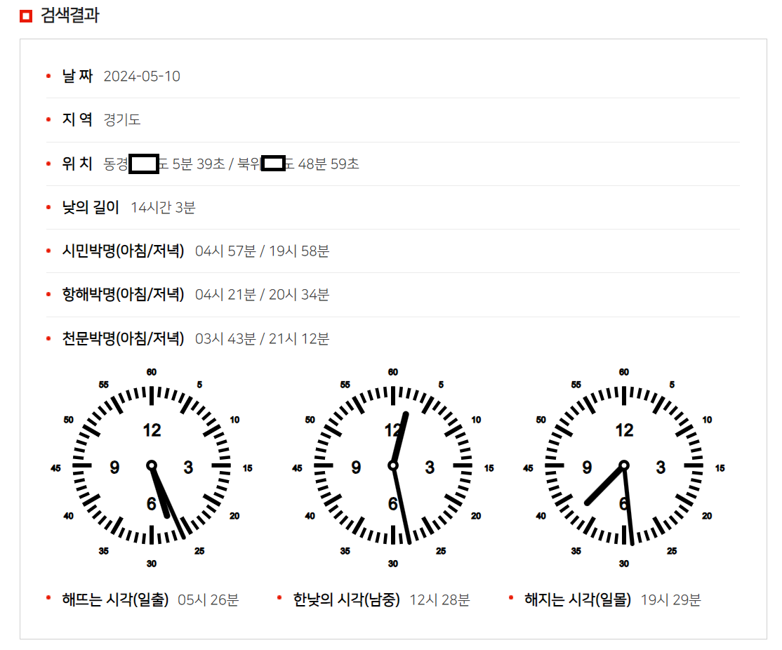 한국천문연구원 kasi 천문우주지식정보 홈페이지에서 일출과 일몰 시각을 알 수 있습니다. 국토지리정보원에서 제공하는 해당 도시의 좌표값을 이용하여 계산한 값을 나타냅니다.