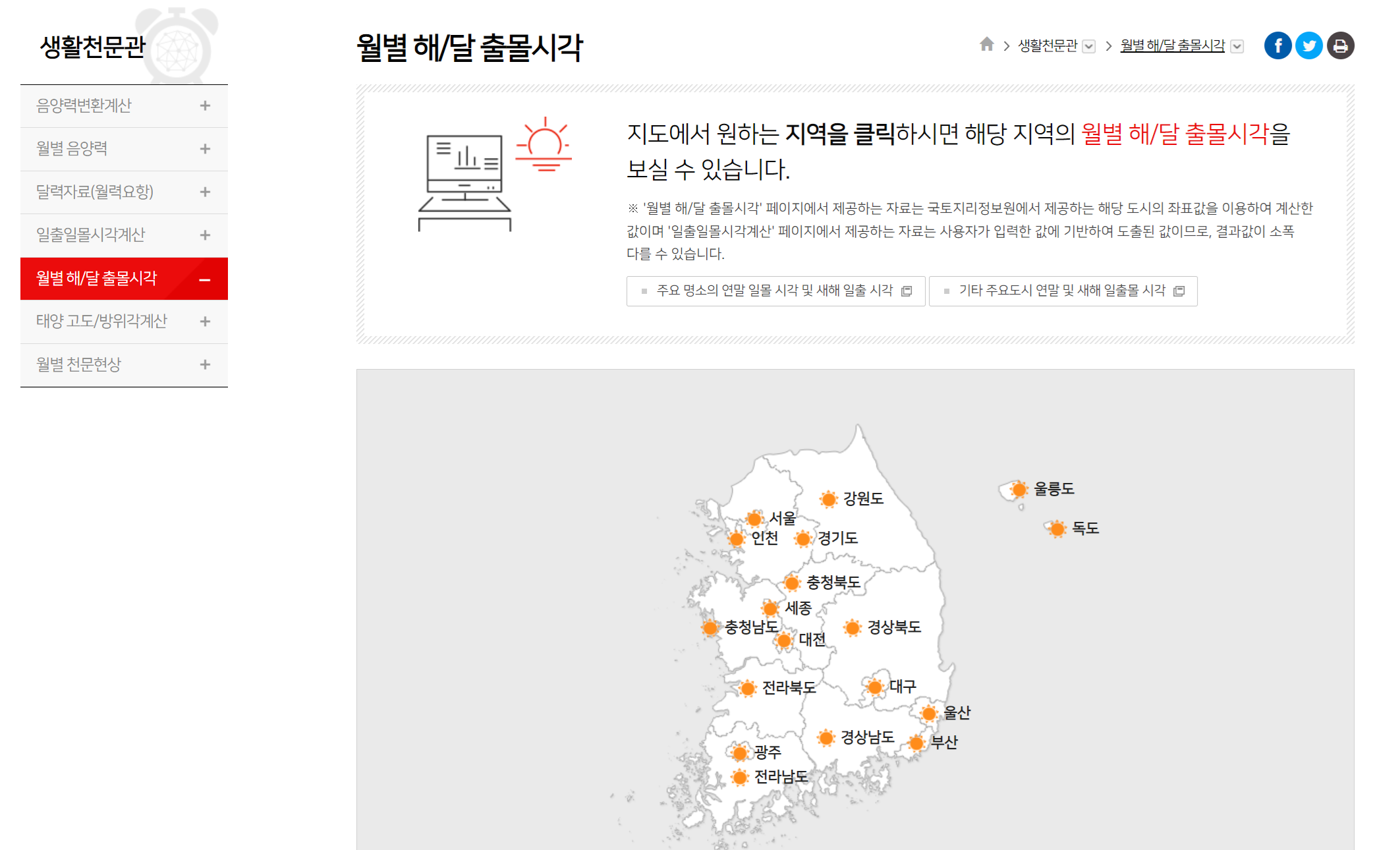 지도에서 원하는 지역을 클릭하여 해당 지역의 월별 해/달 출몰시간을 볼 수 있습니다.