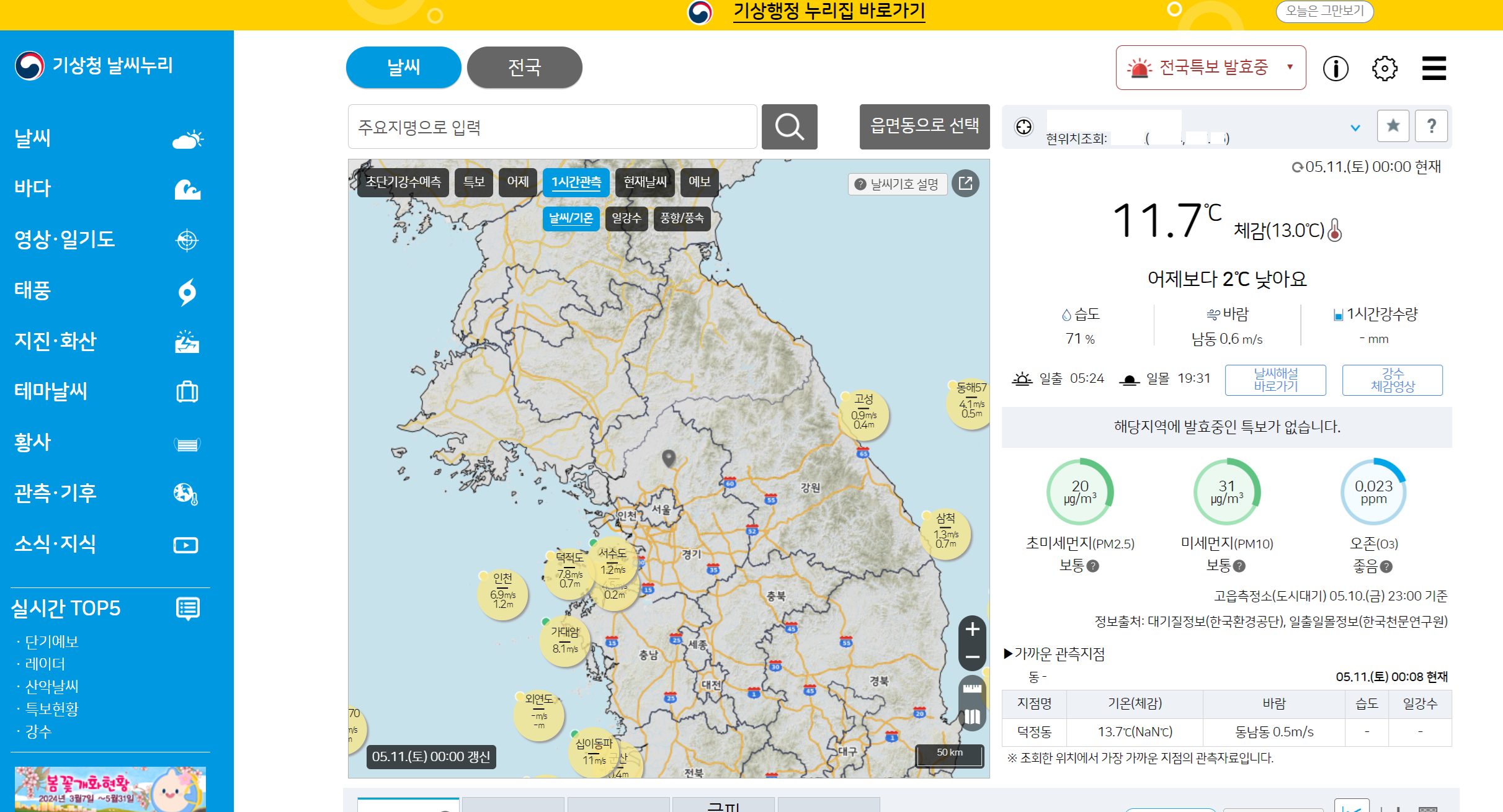 전국 일출 일몰 시간 조회 (기상청 날씨누리)