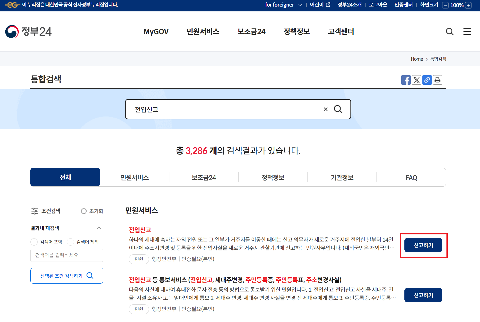 정부24 접속 > 로그인 > 검색 창에 '전입신고' 검색 > 신고하기 버튼 클릭