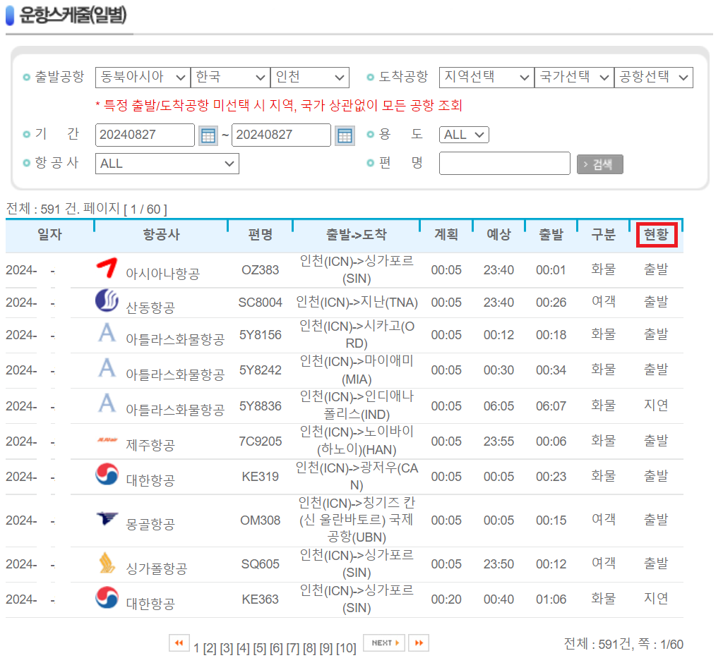 실시간 운항정보에 접속하면 정확하게 결항, 지연, 출발 등의 현황 정보가 나옵니다.