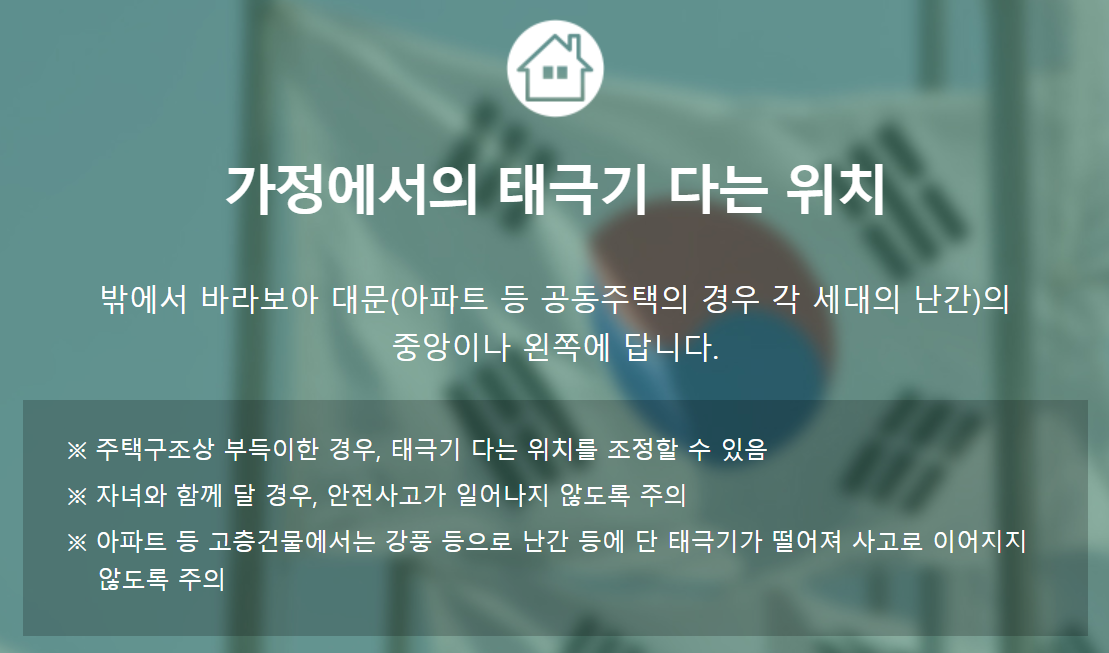 오염되거나 훼손된 태극기는 지방자치단체 민원실 또는 주민센터에 설치된 국기수거함에 넣어주시면 됩니다. 태극기 게양에 대한 자세한 내용은 아래 행정안전부 홈페이지에서 확인하세요.
