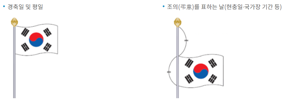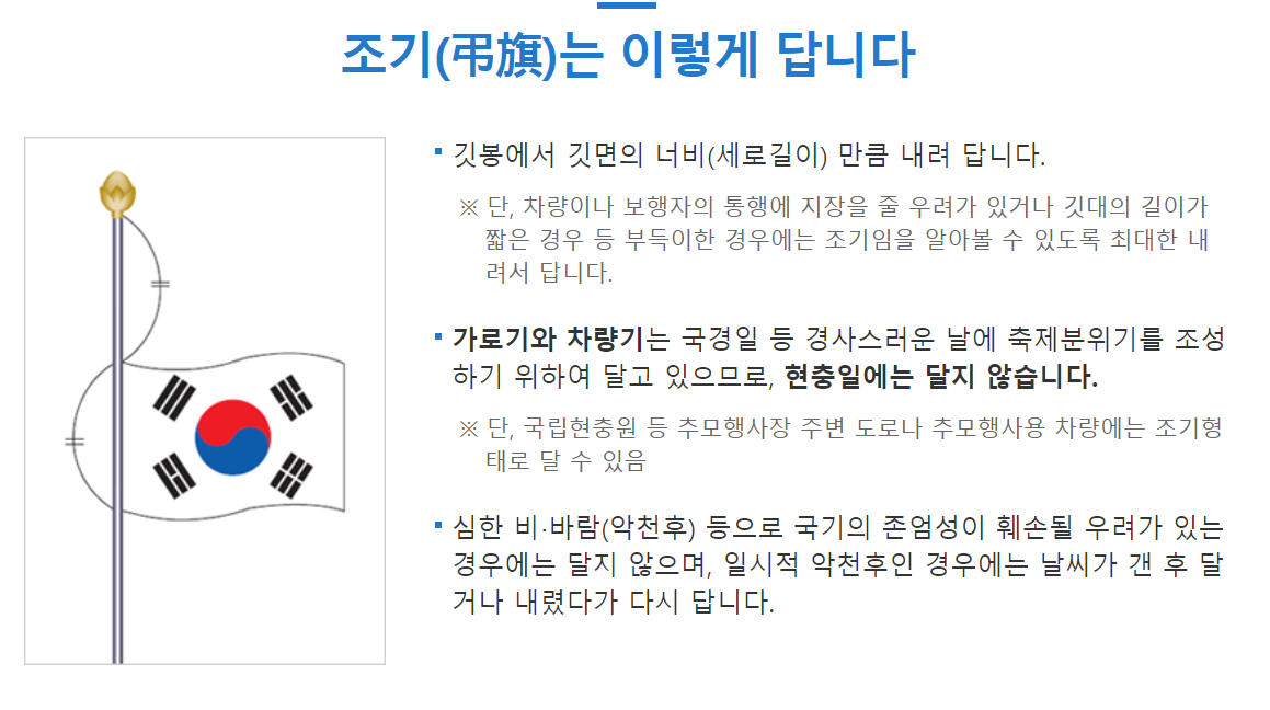 현충일은 조의를 표하는 날이므로 깃면의 너비(세로)만큼 내려서 달면 됩니다. 가로기와 차량기는 경사스러운 날에 축제분위기를 조성하기 위하여 달기 때문에 현충일에는 달지 않습니다.
