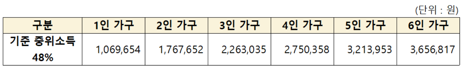소득인정액이 기준중위소득 48% 이하인 가구라면 선정기준에 포함됩니다.