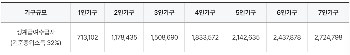 3인 가구의 경우 2,263,035원이며 4인 가구는 2,750,358원 이하입니다. 근로능력여부, 성별, 연령 등에 관계없이 국가의 보장을 필요로 하는 대상으로 소득인정액(소득평가액+재산의 소득환산액)이 기준중위소득 48% 이하인 가구를 대상으로 합니다.