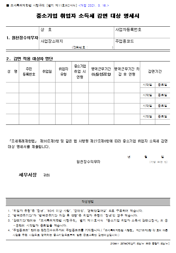 ● 첨부할 서류 : 중소기업 취업자 소득세 감면신청서, 주민등록등본, 근로소득 원천징수영수증, 병역복무기간을 증명하는 서류(해당시)