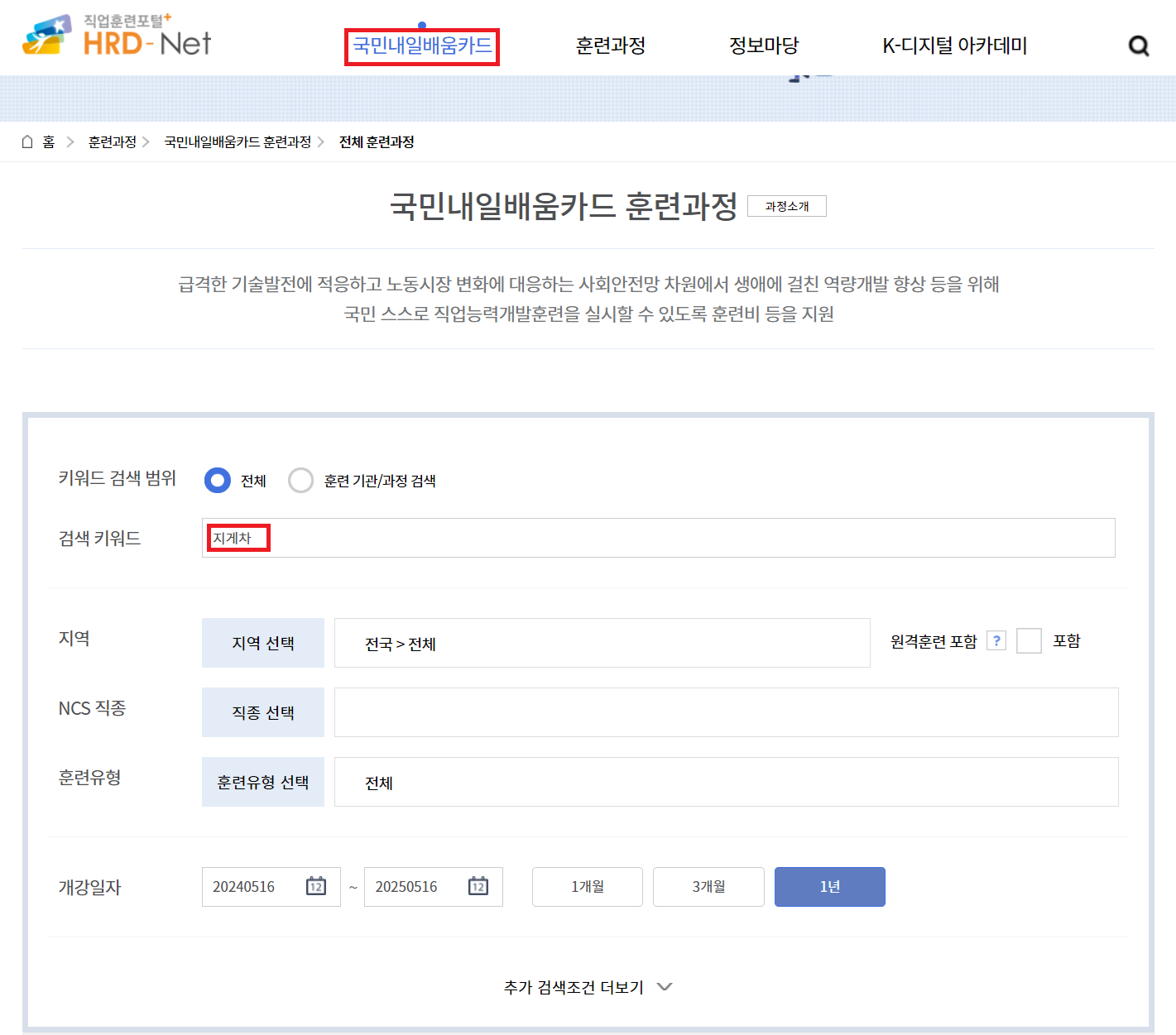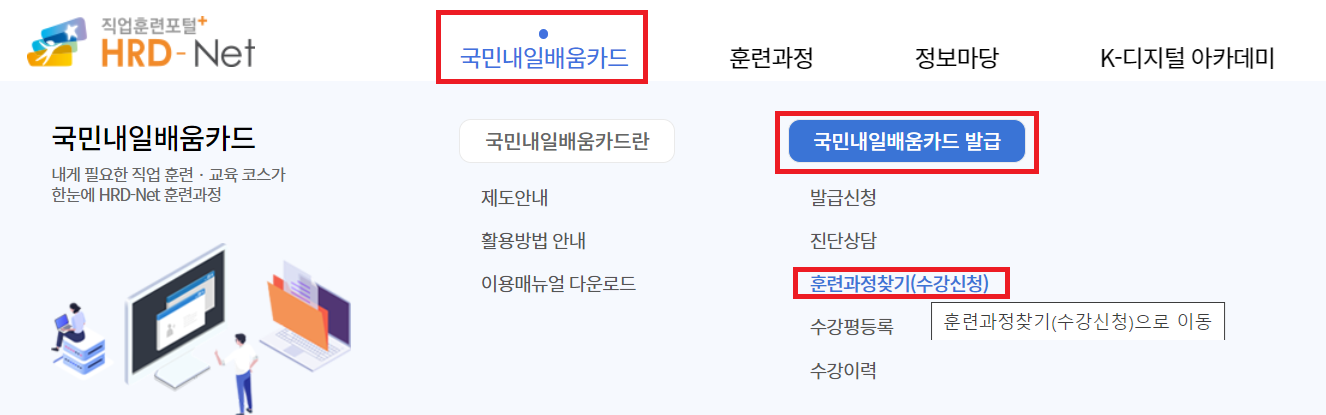 국민내일배움카드를 발급 받은 후에 수강신청을 할 수 있습니다. 카드 발급을 받았다면 HRD넷에 접속>국민내일배움카드>국민내일배움카드 발급>훈련과정찾기(수강신청) 메뉴로 이동하시면 됩니다.