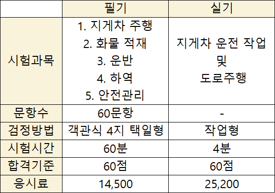 필기는 지게차 주행, 화물적재, 운반, 하역, 안전관리에 대한 내용을 객관식으로 1시간동안 60문항을 풀어야 하고 실기는 4분 내에 운전을 직접 하며 도로를 주행해야 합니다. 합격 커트라인은 필기와 실기 모두 60점이상이면 합격입니다. 필기는 CBT시험으로 바로 합격여부가 확인되지만 실기는 당일에 합격여부를 알 수 없습니다.