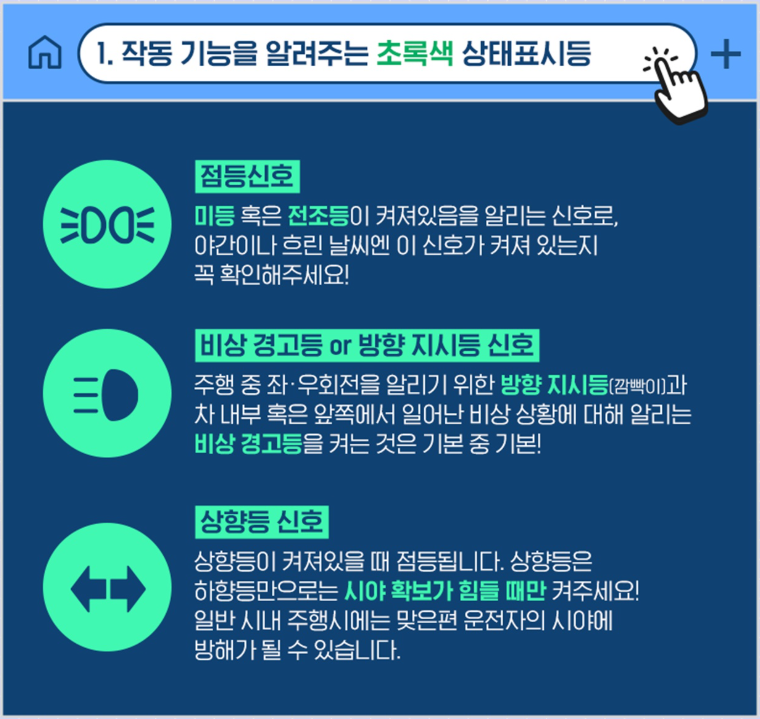 - 초록색 경고등 : 차량의 특정 기능이 활성화된 상태를 나타냅니다. 예를 들어, 방향지시등 작동 시 초록색 화살표가 깜박입니다.