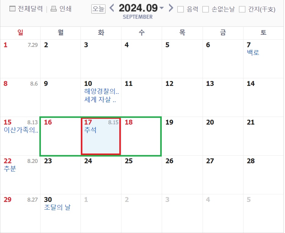 • 추석 연휴 기간 : 2024년 9월 16일 월요일 ~ 9월 18일 수요일