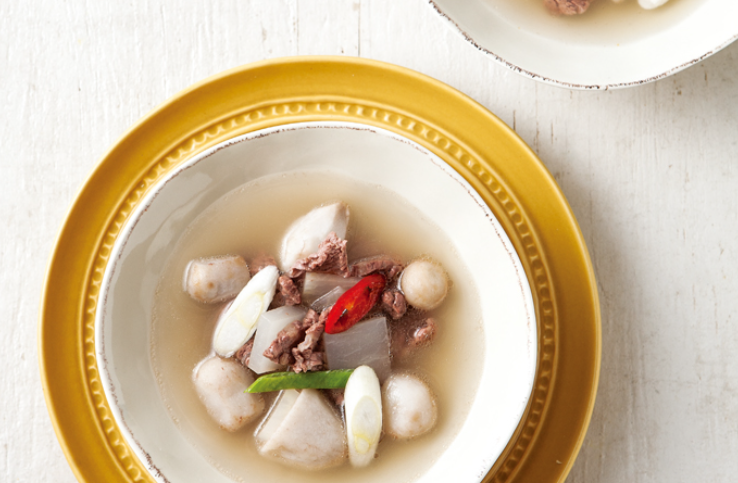 토란은 흙 속의 알이라는 뜻으로, 연잎같이 잎이 퍼졌다고 하여 토련이라고도 합니다. 토란은 추석 전후에 나오기 시작하는데, 이때가 영양이 가장 많고 맛이 좋습니다. 토란국을 만들 때에는 먼저 토란을 따로 삶아서 준비합니다. 토란을 바로 넣어 끓이지 않고, 이렇게 삶은 토란을 따로 준비하는 이유는 토란 특유의 미끌거림을 줄일 수 있고, 토란의 독성분도 빼낼 수 있기 때문입니다.