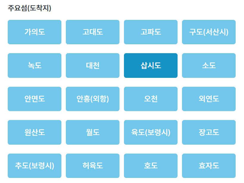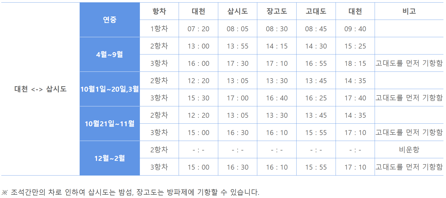 | 대천-삽시도 | 출항 | 1,050원 | 13,050원 | 6,250원 | 11,750원 | 10,450원 |