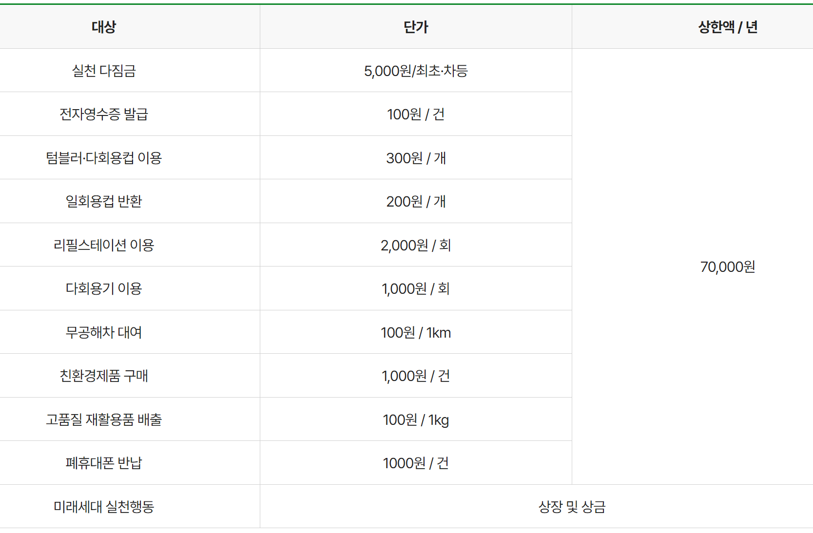 ※ 실천 다짐금 1회 이상 참여시 1,000원 지급, 3회 이상 참여시 1,000원 추가 지급, 5회 이상 참여시 1,000원 추가 지급, 10회 이상 참여시 2,000원 추가 지급 됩니다.