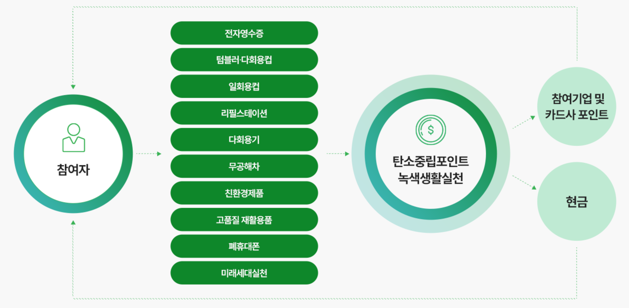 국민의 탄소중립 생활 실천문화 확산을 위하여 친환경활동을 하면 이용실적에 따라 한국환경공단에서 인센티브를 지원하는 제도입니다.