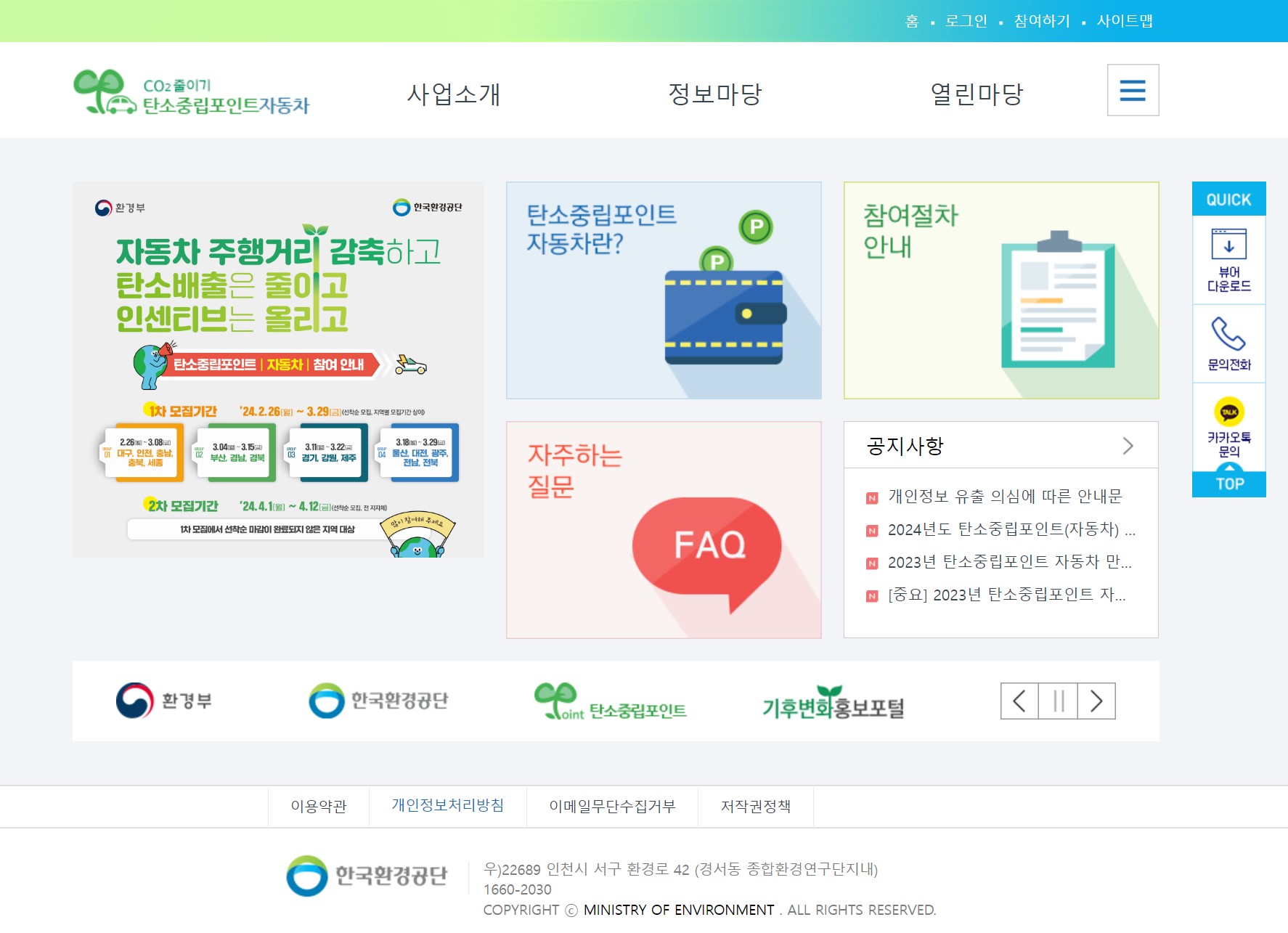 - 탄소중립포인트 자동차 홈페이지 접속하고 회원가입하여 신청이 가능합니다. 모집기간은 매년 2월~3월 경 입니다.
