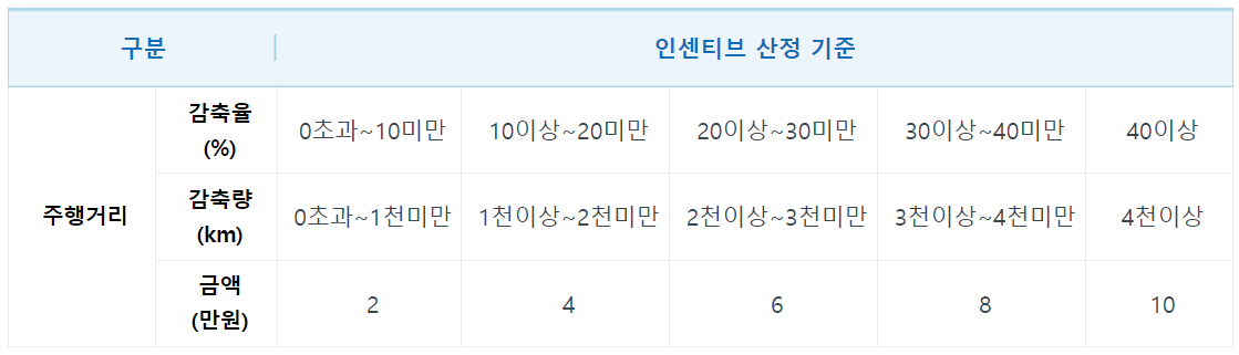 - 주행거리 감축 실적에 따라 0~10만원을 12월쯤 지급을 합니다.