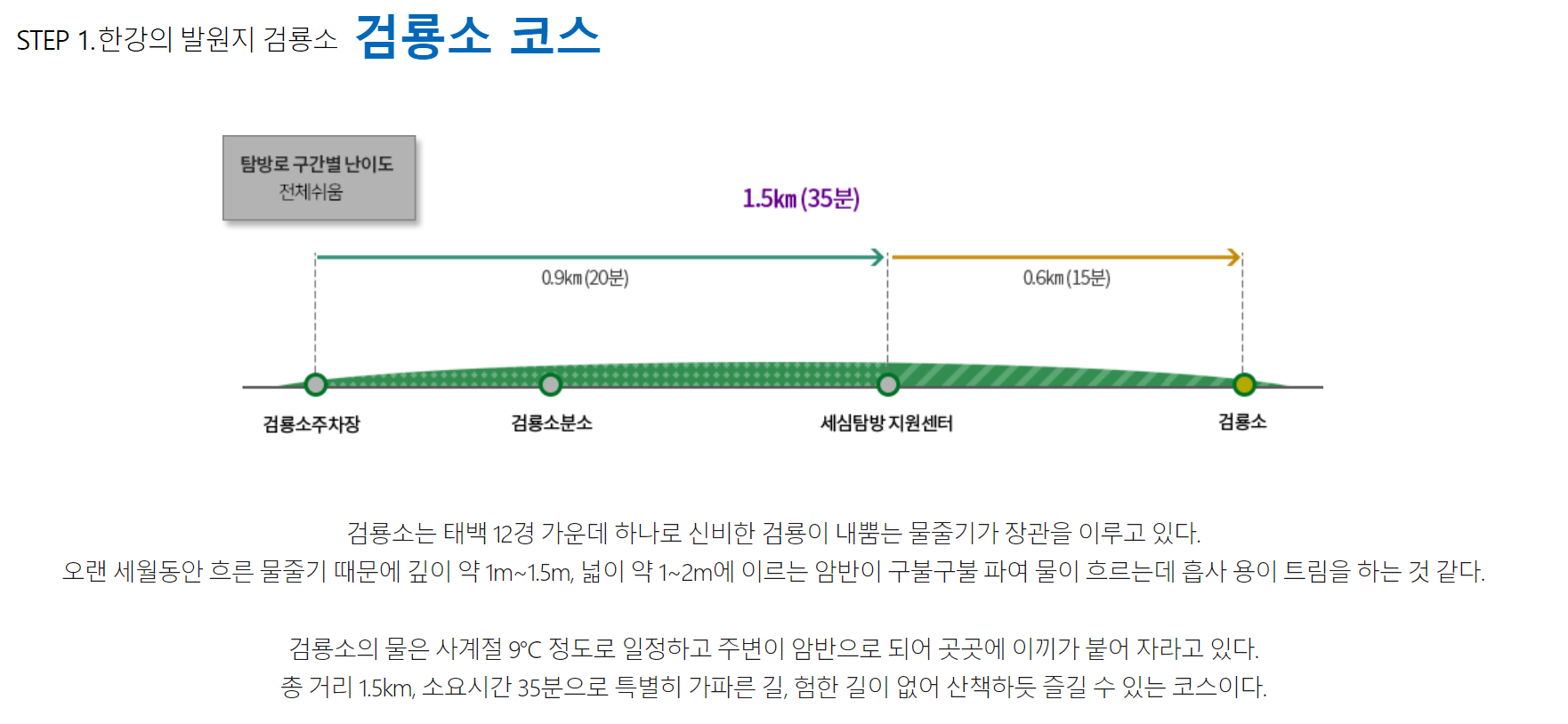 난이도가 쉬운 검룡소 코스는 총 1.5km, 소요시간 35분으로 산책하듯 즐길 수 있습니다.