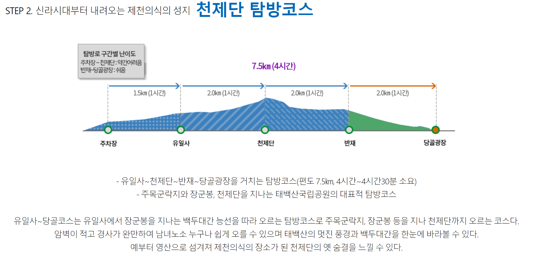 주차장부터 천제단까지는 약간 어렵고 반재부터 당골광장까지는 쉬운 천제단 탐방코스는 편도 7.5km, 4시간30분이 소요됩니다. 태백산의 멋진 풍경과 백두대간을 한 눈에 볼 수 있어서 추천드립니다.