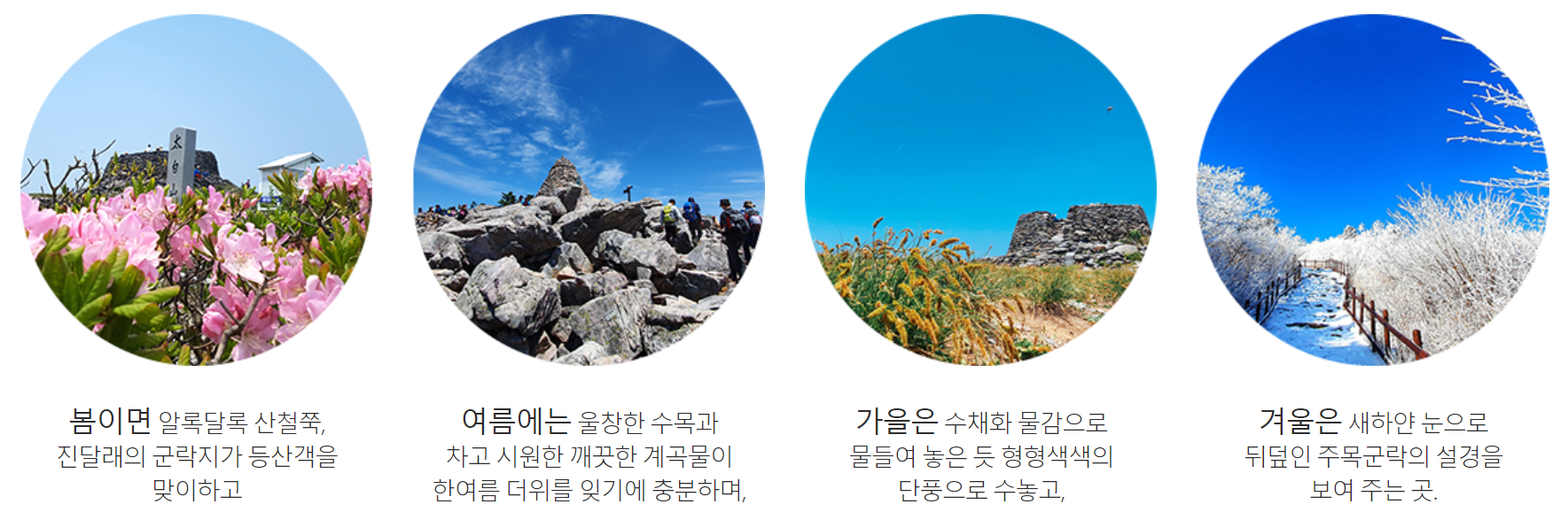 암벽이 적고 경사가 완만하여 누구나 쉽게 오를 수 있는 산입니다. 정상에는 고산식물이 자생하고 봄에는 산철쭉, 겨울에는 하얀 눈꽃 절경이 아름답습니다.