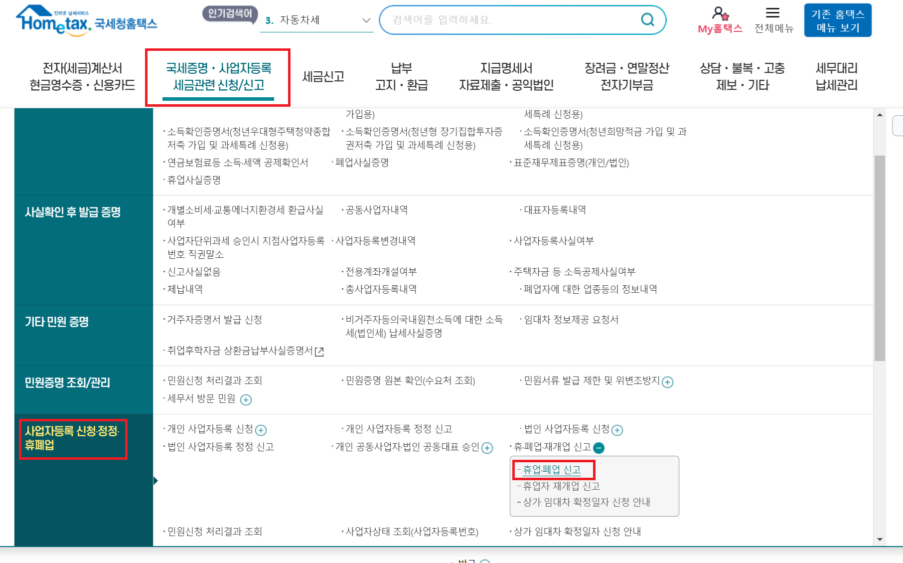 홈택스에 접속하여 [국세증명·사업자등록·세금관련 신청/신고] 메뉴를 선택하고 [사업자등록신청·정정·휴페업] 카테고리에서 [휴업·폐업 신고]를 클릭하여 진행합니다. 인증서 로그인을 한후에 진행해주시면 됩니다.