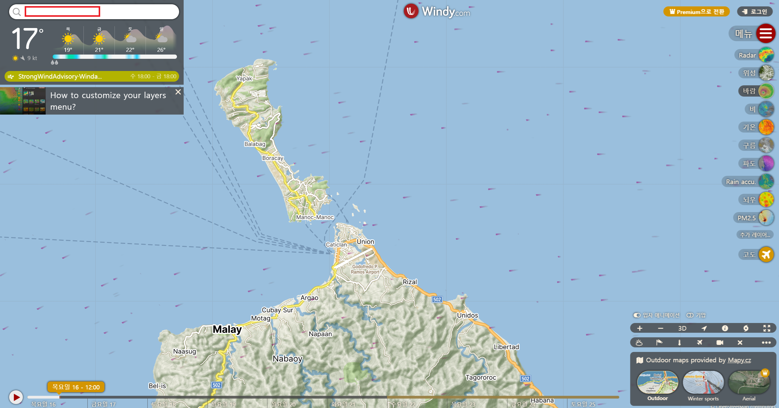 윈디사이트는 한국어로 검색할 수 있어서 간편하게 사용할 수 있습니다. 왼쪽 위의 돋보기 쪽에서 검색하여 그날 날씨를 확인할 수 있습니다.
